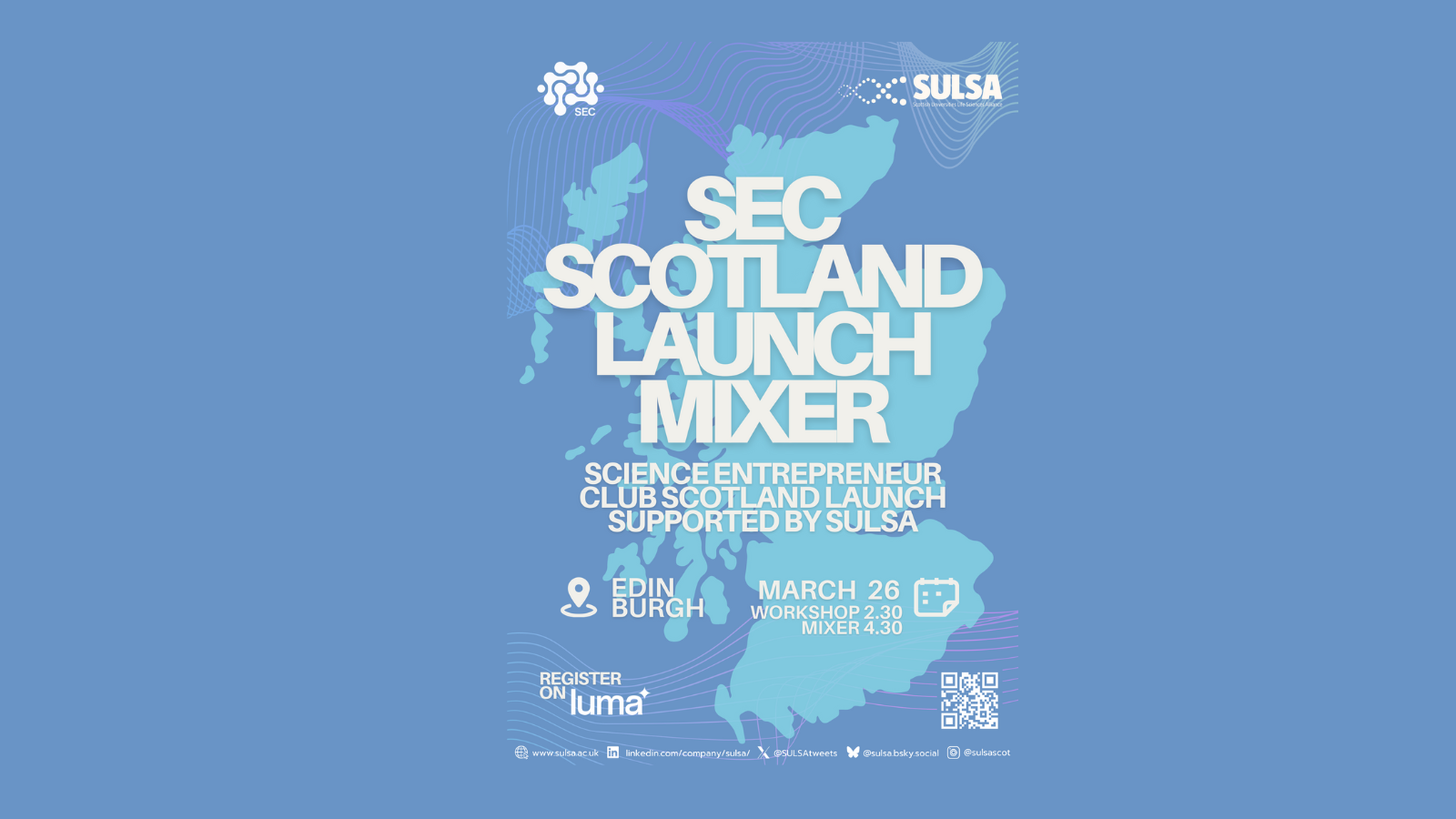 - Following this workshop for researchers (PhD stage upwards), the SEC’s network of entrepreneurs and investors will join for an evening of networking and the official launch of the SEC Scotland Chapter. SULSA and BioAcademic researchers are welcome to join for the workshop and/or the mixer!